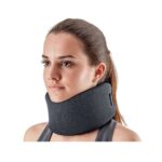 R: Posicione o colar em torno do pescoço com o fecho aderente na nuca, ajustando-o para que fique firme e confortável, proporcionando suporte adequado.