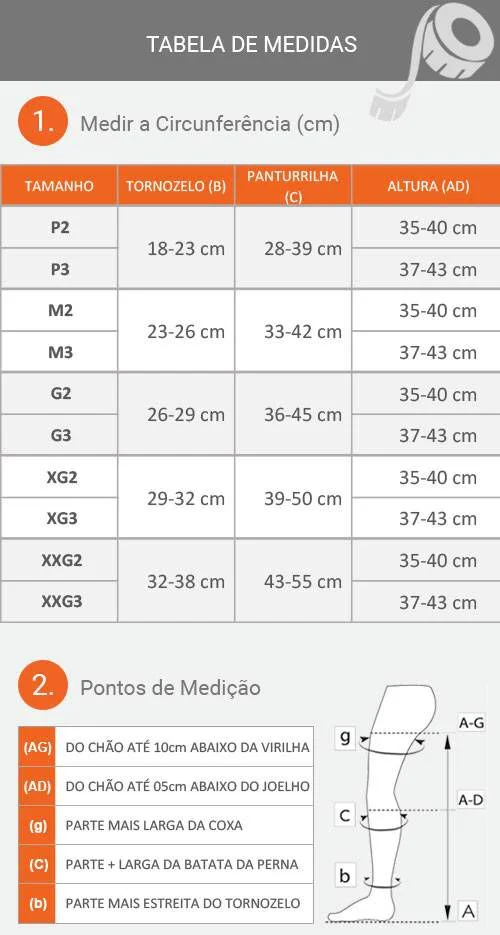 | XXG | Tornozelo (B): 32-38 Panturrilha (C): 43-55 |