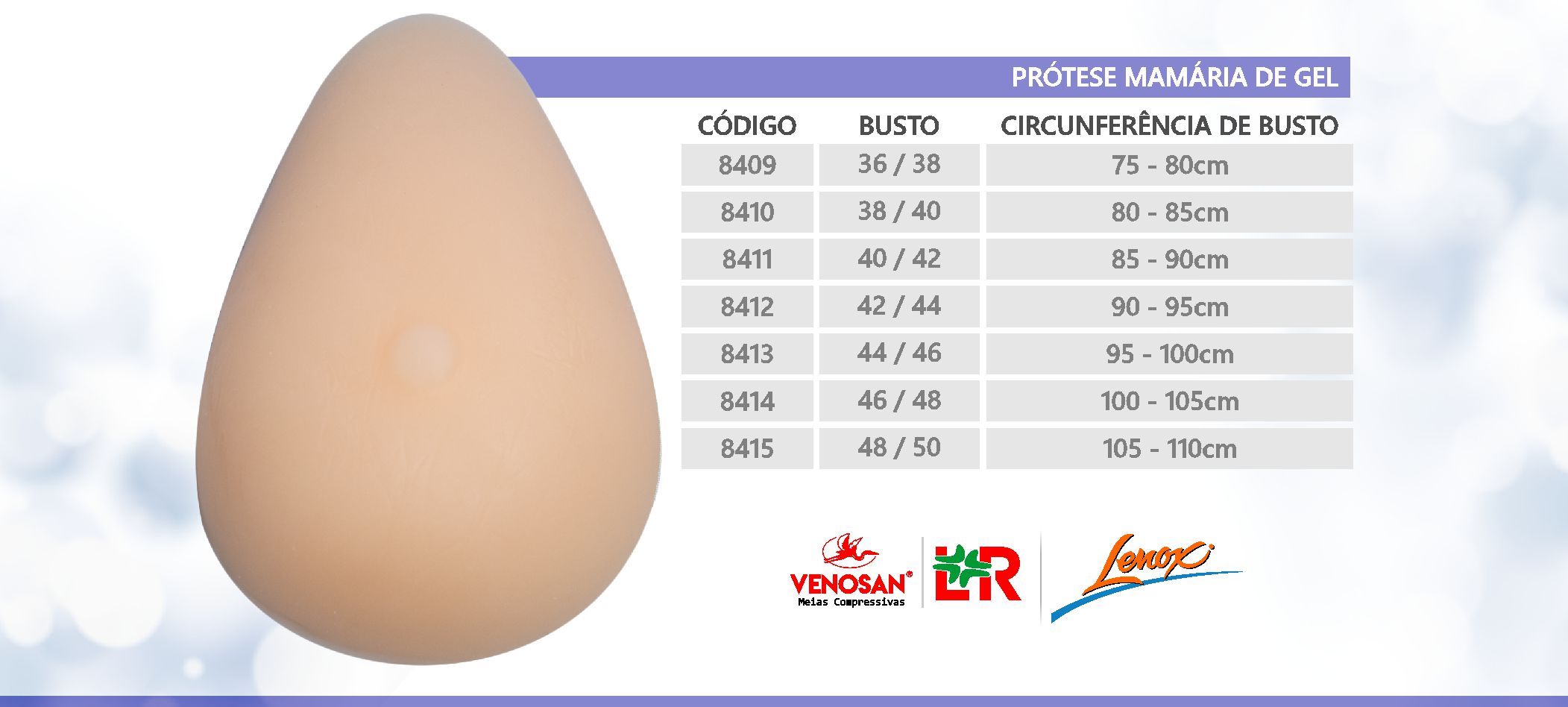 Formato em gota, volume e peso que simulam perfeitamente a mama real, proporcionando uma aparência natural.