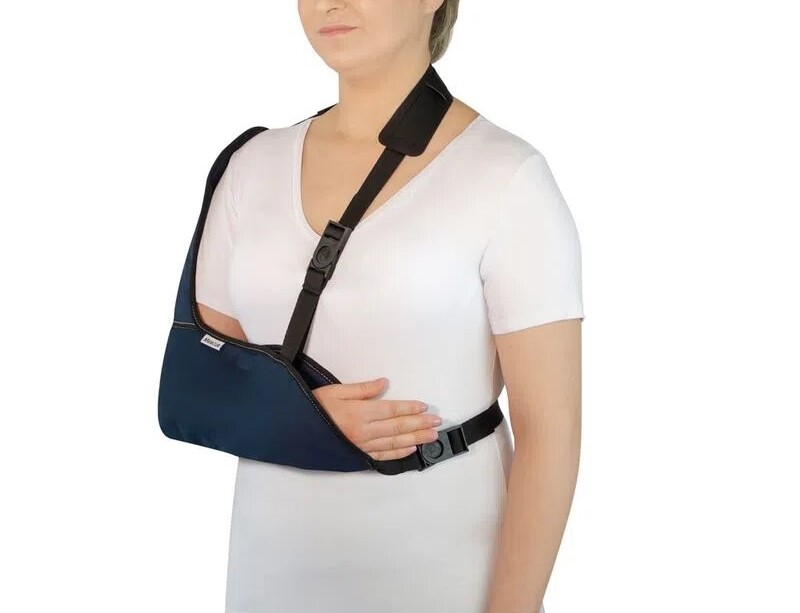 - Coloque o braço na tipoia, posicionando o cotovelo no ângulo da tipoia.